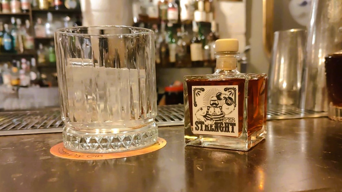Illustration for Leonardo Giorgini & Cosimo Cisternino Strong Man drinkfor Paragon Lounge Bar 700 Circus Themed Mixology Drink List.